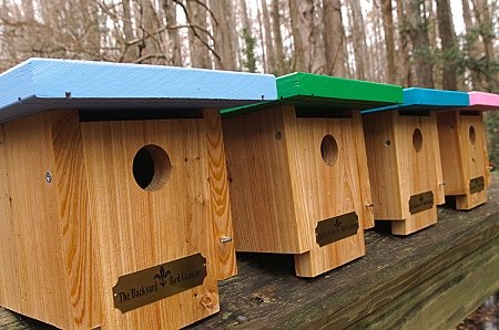 BYBC Garden Delight, The Backyard Bird Companie's Garden Delight House Wren Houses are made of 3/4" cypress with a painted roof to preserve the roof and add color to your backyard. Because of the lack of feathers, fledglings, in the first few weeks of life, are vulnerable to rain. Each oversized roof has a drip line underneath to ensure a dry box. The bottom floor is 4 x 3 3/4" with cut edges for drainage. The front panel lifts up for easy cleaning and is secured with a L-hook. Box includes a hanging clip in back and also has one pre-drilled hole for mounting. The opening entance hole of the house is 1" for House Wrens species. The male house wren is known for selecting multiple houses to entice the female. The more houses on your property the better chance of occupation. Select your color choice of Pretty pink, Sky blue, Irish green, Ocean Teal, Forest Green and Earth Brown.