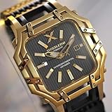 XOSkeleton , XOSKELETON Men's Automatic Intercontinental Voyager Gold-Tone and Black Ion Plated Steel Watch. The automatic movement on the Limited Edition (only 400 made) Intercontinental Voyager Gold-Tone and Black Ion Plated watch marks a new and important chapter in Xoskeleton's history. The new caliber, XOS1859, with 21 jewels to reduce friction and a power reserve of 36 hours, a Geneva patterned main-plate and a Swiss-Made mainspring creates an even more striking look. The smoothness and torque of the movement glides the seconds hand effortlessly around the dial, while the rotor moves gracefully and efficiently - never needing a battery. The Automatic Intercontinental Voyager's square watch case is dominated by the "O" rings octagonal shape. Specially sourced the watchcase and "O" ring are made from 904L goldtone plated steel. The sapphire crystal is polished on the sides leading to a cambered center. The flowing lines and the curved connectors give the timepiece an assertive equilibrium of power and elegance. The lines leading to the curved lugs connected to the fifteen links, solid stainless-steel black IP plated bracelet are unmistakable and give the Voyager an even more striking look, impressive on any continent. 904L gold-tone plated stainless steel case.15 links black IP plated stainless steel - Clasp: Push button dual deployant with stamped Xoskeleton safety clasp - Crystal: Sapphire cambered crystal with anti-reflective undersurface - Illumination: White phosphor on Hour and minute hands Movement: Automatic self winding Xoskeleton caliber movement. 21 jewels.Watch face: Black textured dial, Gold "X" logo at 12 o'clock. Inner square ring repeating Xoskeleton name in gold. Date display at 3 o'clock. Gold-tone luminous hands and stick indexes. Water Resistance 100 meters. XOSKELETON gift box, instructions and 1 Year Warranty included! Case Diameter: 46mm; Case Thickness: 13mm; Bracelet Width: 27mm; Bracelet Size: fits up to 9 inch wrist. MSRP: $1895.00 ...